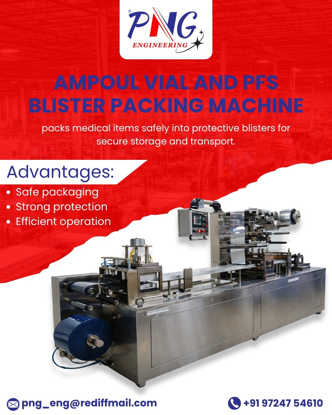 Fully Automatic Blister Packing Machine Manufacturer in India. In today’s fast-paced pharmaceutical industry, precision and efficiency in packaging are key. PNG Engineering, a reputed Fully Automatic Blister Packing Machine Manufacturer in India, delivers advanced, high-speed blister packing solutions designed for accuracy, performance, and durability. Engineered for Excellence Our Fully Automatic Blister Packing Machine, model PNG 240, is built to meet demanding pharmaceutical packaging requirements with unmatched precision. Designed to handle a wide range of products — from tablets and capsules to ampoules and vials — this machine ensures seamless performance for high-volume operations. Technical Specifications: • Capacity: 250 pcs/hr • Automation Grade: Automatic • Phase: 3 Phase • Voltage: 440 Volts • Driven Type: Mechanical • Forming Depth: 16 mm • Pack Length: 135 mm • Cutting Frequency: 240 strips/min • PVC Base Film Width: 210 mm • Compressed Air: Not required • Model: PNG 240 • Country of Origin: Made in India This model offers high-speed performance while maintaining precision sealing, forming, and cutting, ensuring every blister pack meets industry standards. Applications Across Industries While primarily designed for pharmaceuticals, the machine’s adaptability makes it suitable for: • Healthcare Products: Nutraceuticals, supplements, and syrups. • Cosmetics: Compact packaging for creams, tablets, and capsules. • Industrial Items: Small electronic components and hardware. The machine’s mechanical precision and robust build ensure consistent packaging quality across every batch. Why Partner with PNG Engineering? As a trusted manufacturer of Fully Automatic Blister Packing Machines in India, PNG Engineering combines innovation with practicality. Each machine is crafted for smooth operation, reduced downtime, and consistent output — helping pharmaceutical manufacturers achieve higher productivity with minimal maintenance. Key Benefits: • High Efficiency: Consistent production rate with accurate forming and sealing. • User-Friendly Operation: Simple controls and ergonomic design for easy use. • Low Maintenance: Durable mechanical system that minimizes wear and tear. • Energy-Efficient: Operates efficiently without the need for compressed air. • Fast Delivery: Ready stock and quick dispatch for prompt installation. Whether you’re packaging for large pharmaceutical companies or small-scale production units, the PNG 240 Blister Packing Machine delivers the reliability and speed your business demands. Your Reliable Packaging Partner With a strong focus on innovation and customer satisfaction, PNG Engineering has earned a solid reputation as a dependable manufacturer of Full Automatic Blister Packing Machines in India. Our solutions are designed to enhance operational efficiency, maintain hygiene, and ensure compliance with international packaging standards. Partner with PNG Engineering for high-performance, cost-effective, and reliable blister packing solutions.